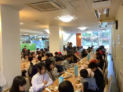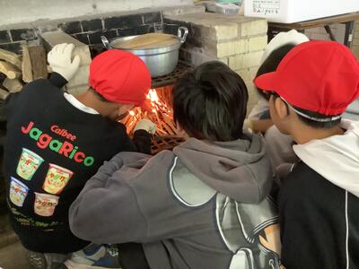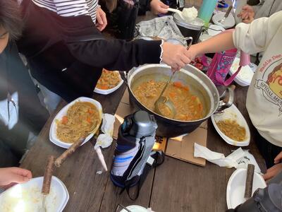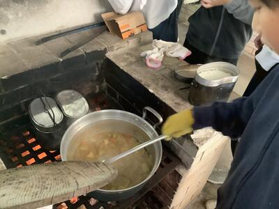 煙で目が痛い中、みんなでカレーのルーやご飯を作っっていきます。