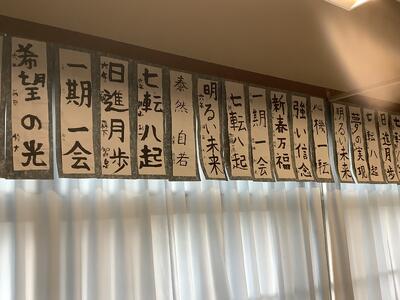 6年生の教室には、それぞれが選んだ書き初めが並んでいます。