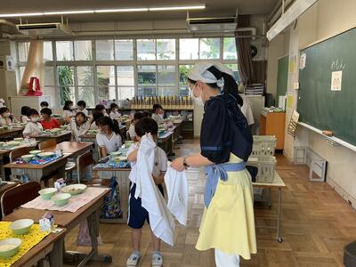 準備はもちろん、準備後の白衣のたたみ方、牛乳パックの開け方など、担任1人ではできないサポートをしてもらっています。
