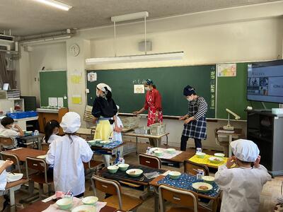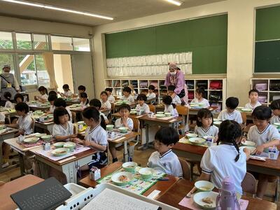 PTAのサポーター制度の活動の1つ、1年生の給食サポートをしていただいています。