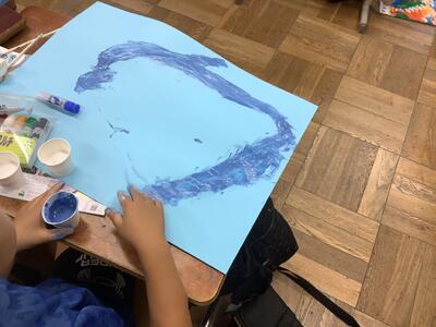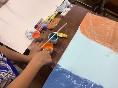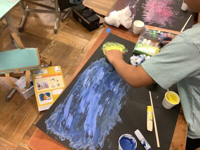 2年生の図工で、指を使って色塗りをしています。