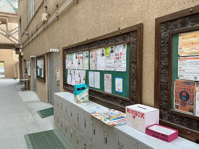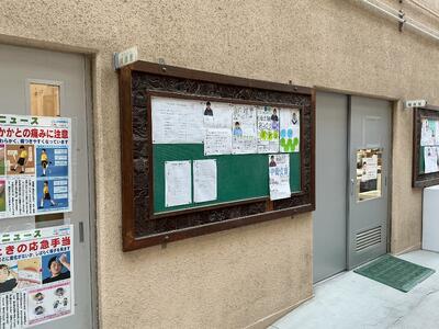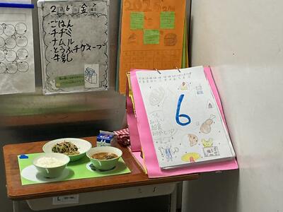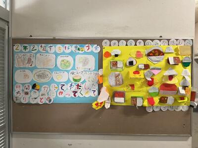 給食にちなんだ作品に1人ひとりメッセージを書いたり、給食室で使えるカレンダーと作ったり、学級会などで話し合って決めたものが、掲示されています。